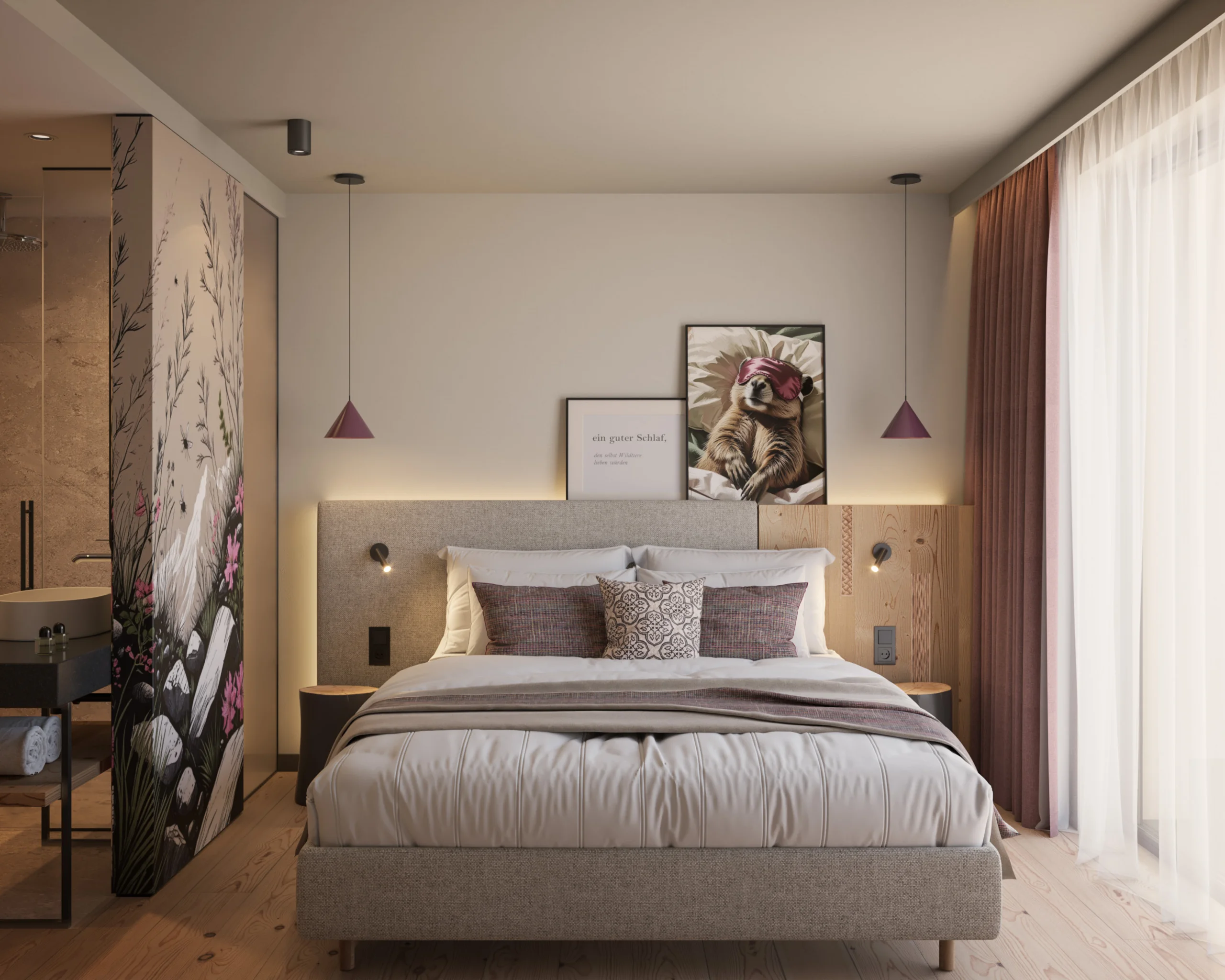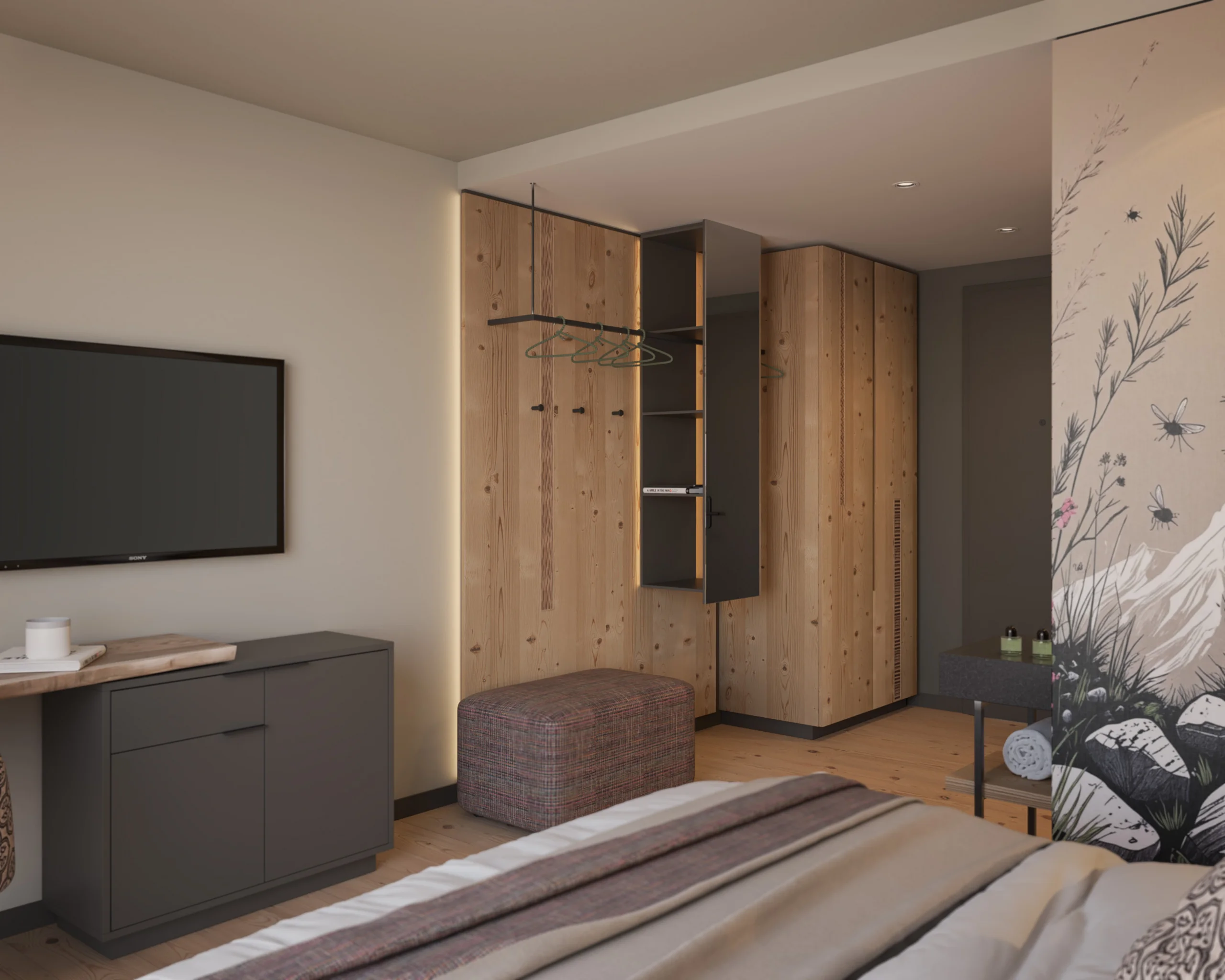 Gemütlich schlafen wie auf einer Almwiese: Schreibtisch, Smart-TV und Holzboden