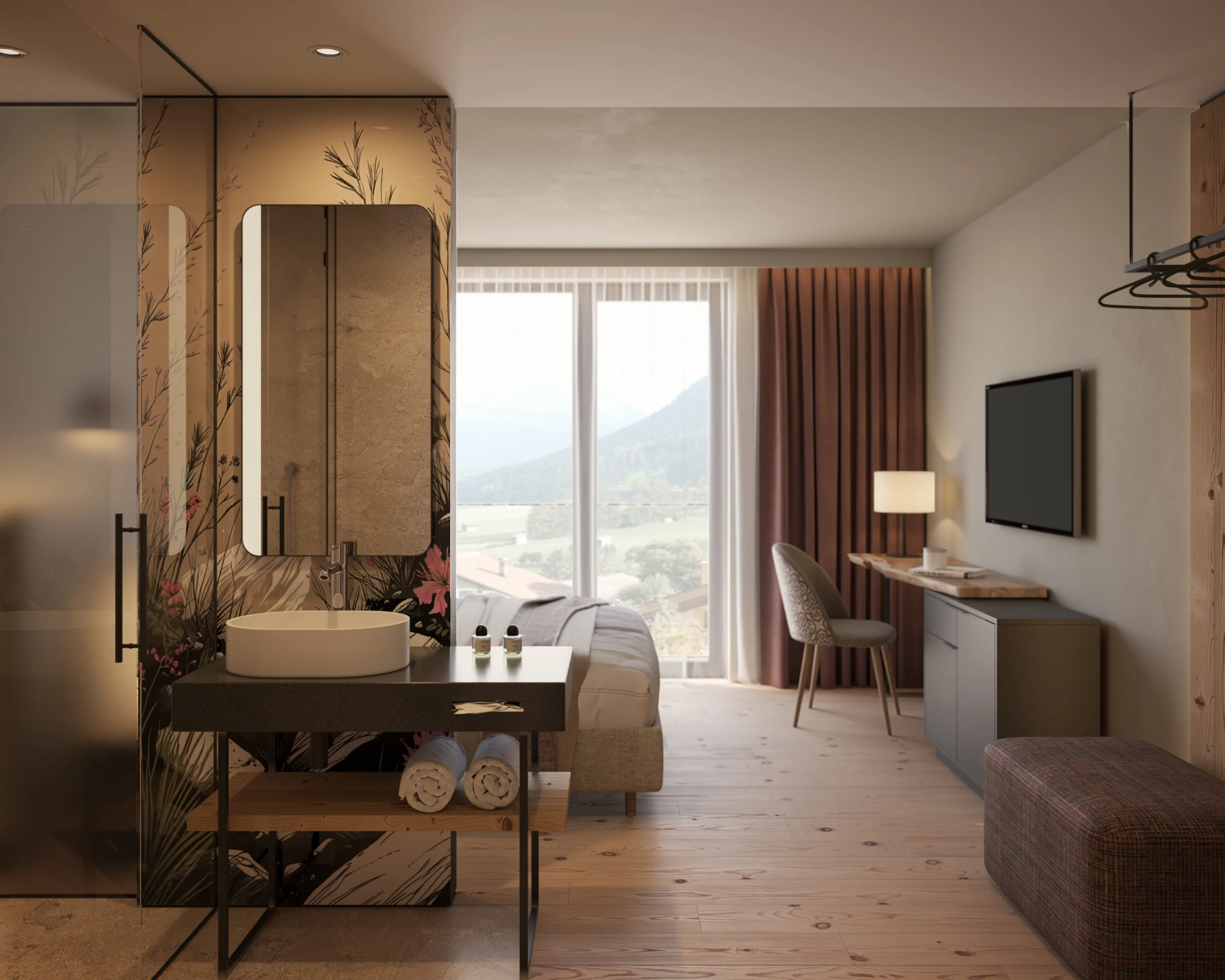 Hier nächtigst du majestätisch wie der Hirsch: Balkonzimmer mit Ausblick, Smart-TV, Schreibtisch und Parkettfußboden, offenem Badezimmer - für mehr Freiraum, geschlossenem WC - für mehr Privatsphäre